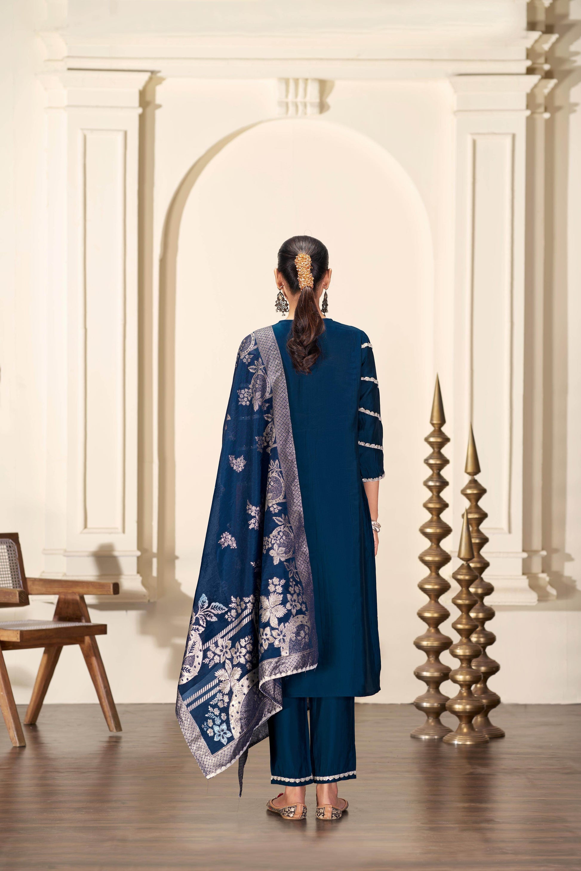 Almina Navy / Red Kurta Set with Dupatta is a refined, evening-ready three-piece ensemble in rich navy / Red Roman silk, designed for a flattering, tailored look with a coordinated dupatta for effortless elegance.