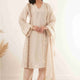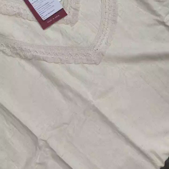 This elegant V-neck top features intricate crochet lace and a plain base, making it versatile for any event. Styled effortlessly with simple plain pants, it creates a refined ensemble. Crafted from soft viscose anmol tissue, it measures 40 inches in length for the top and 39 inches for the bottom. The exquisite hand embroidery and prominently embroidered border add a luxurious touch. Presented in a sophisticated cream hue, this piece combines premium fabric and meticulous stitching for a designer finish, ideal for weddings, festive occasions, and parties. Dry clean only for lasting quality.