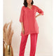 This elegant set features a red Bandhani-printed kurti with mirror work, crafted from organza fabric. The straight-cut, above-knee kurti has a V-neck and three-quarter sleeves, paired with solid organza trousers and a matching camisole. Designed for a refined silhouette and effortless wear, it blends traditional artistry with modern style. Dry-clean recommended.