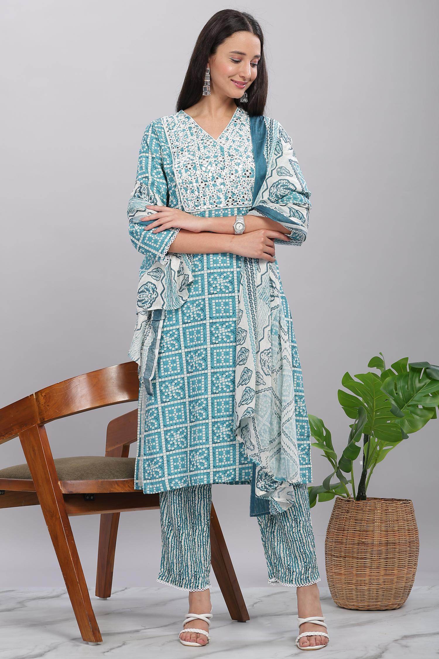 Elevate your ethnic style with the stunning Firdous Blue 3-piece Rayon Kurta Set with Dupatta from Bulbul Fashions. Crafted from soft and breathable rayon fabric, this elegant ensemble ensures all-day comfort with a refined, festive appeal. The A-line blue printed kurta features delicate detailing and a flattering silhouette, paired with perfectly coordinated solid rayon pants and a lightweight chiffon dupatta to complete the look.