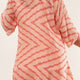This elegant peach organza kurta features a delicate floral print with subtle mirror work embellishments, crafted in a straight silhouette with a V-neck and three-quarter sleeves. The knee-length kurta pairs seamlessly with solid organza trousers designed for comfort and ease with a slip-on closure. Included is a matching camisole for added coverage. Made from machine-woven organza fabric, this set offers a refined, coordinated look perfect for sophisticated occasions. Dry clean recommended for maintaining quality and style. Model height 5'8", wearing size S. The package includes kurta, trousers, and camisole.