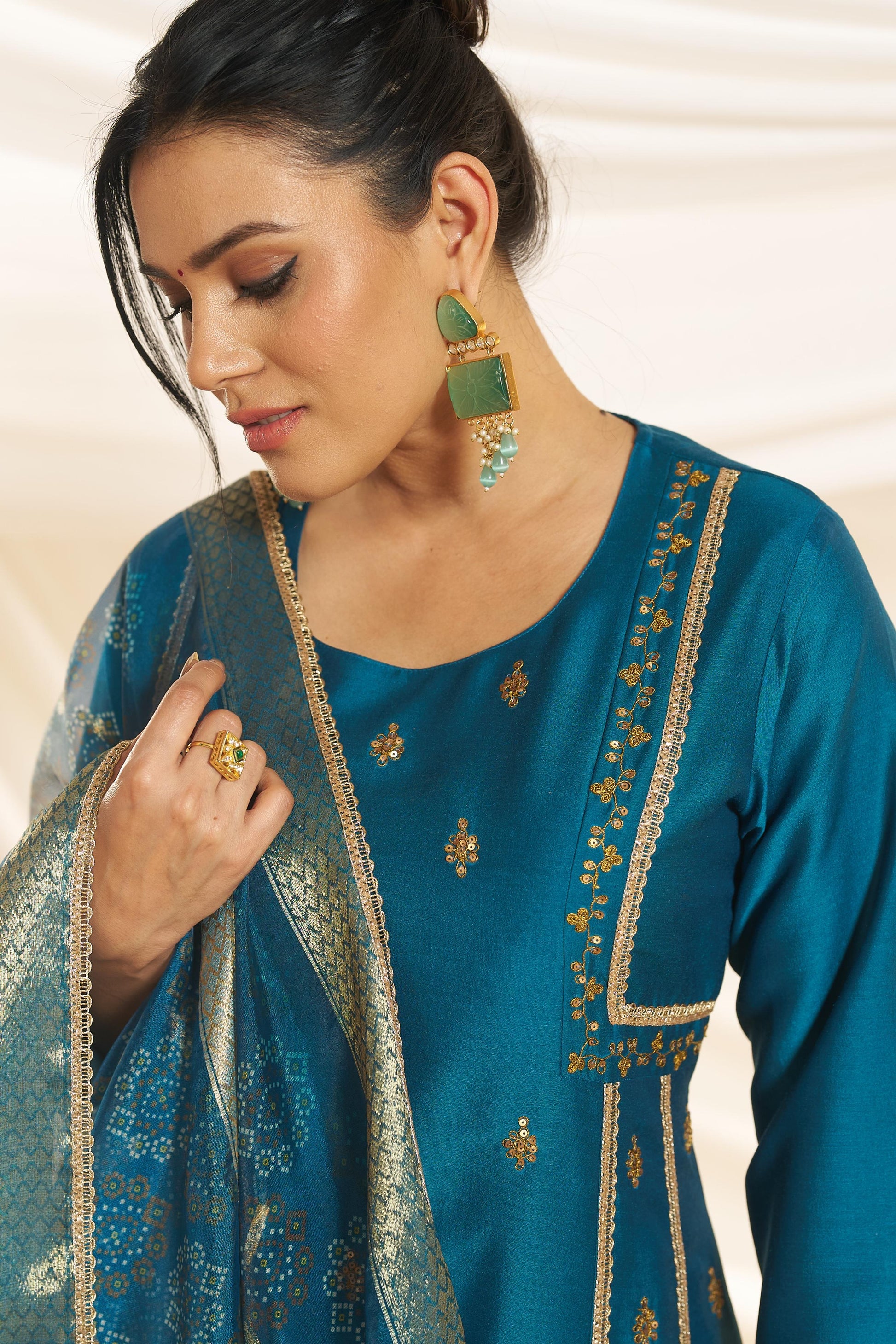 Kayra Teal Sequins A-Line Suit Set - Chinnon Silk with Cotton Lining