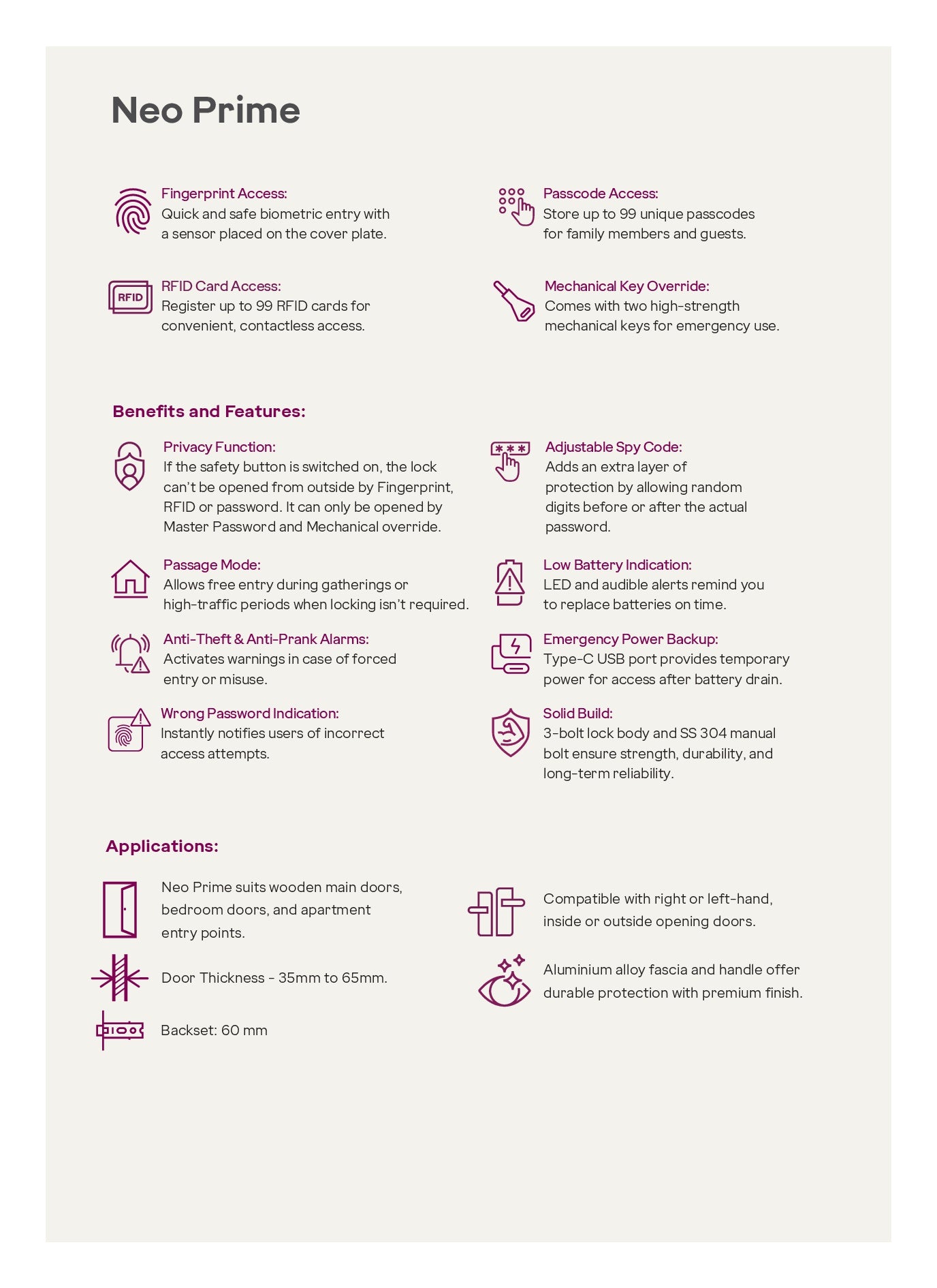 Presenting Godrej Neo Prime, a premium digital lock that elevates everyday living with best-in-class safety and elegant design. Combining advanced access modes with multiple safety features, Neo Prime is ideal for homeowners who want both protection and style. Available in Rose Gold and Titanium Grey finishes, Neo Prime enhances modern interiors with a touch of luxury.