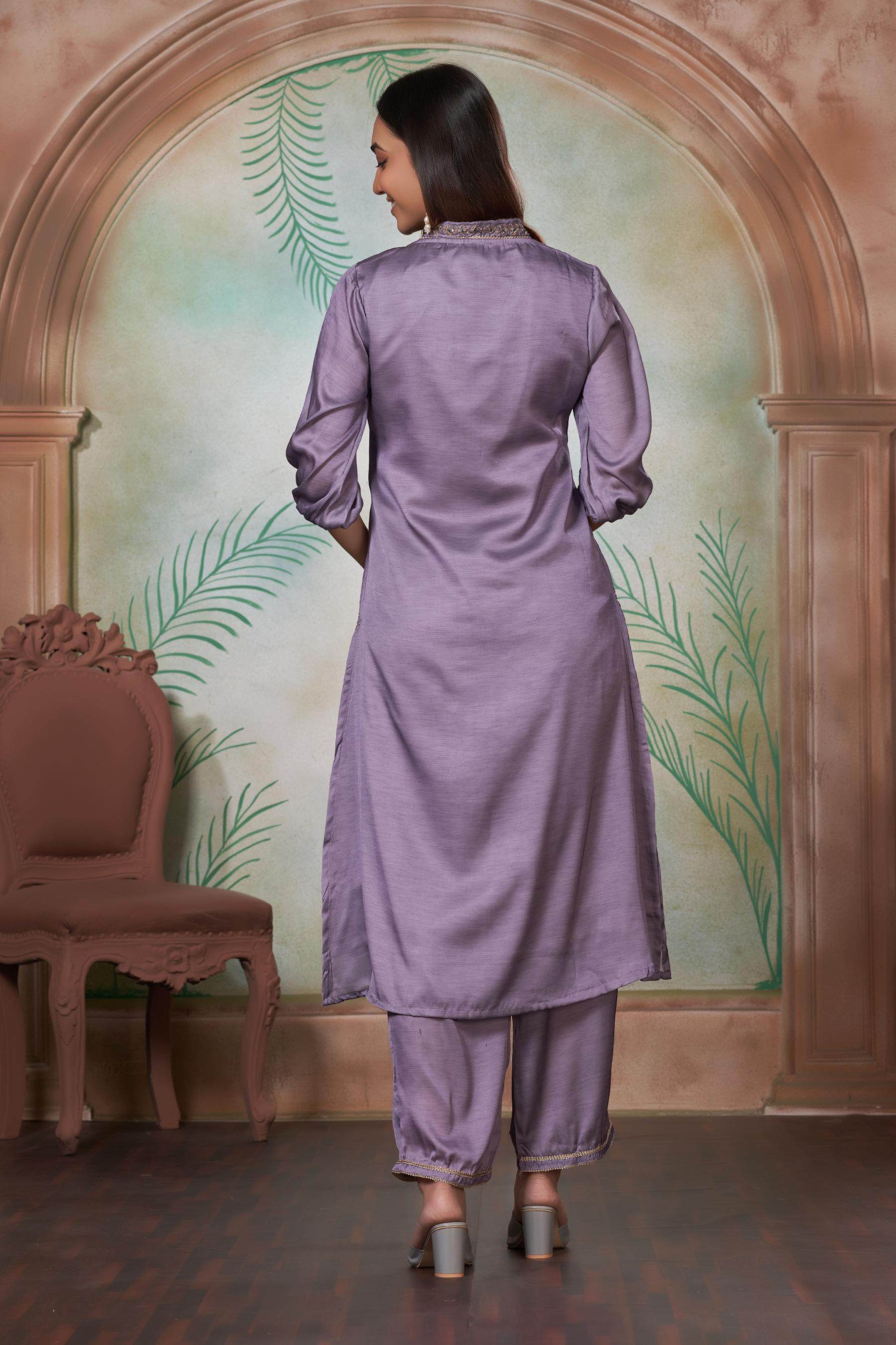 Made with vanilla satin silk, this set ensures comfort and breathability, making it ideal for long-lasting wear. Whether you're attending a festive event, casual gathering, or simply enjoying a day out, the Shama Peach / Purple Kurta Set will keep you looking effortlessly chic and stylish throughout the day.
