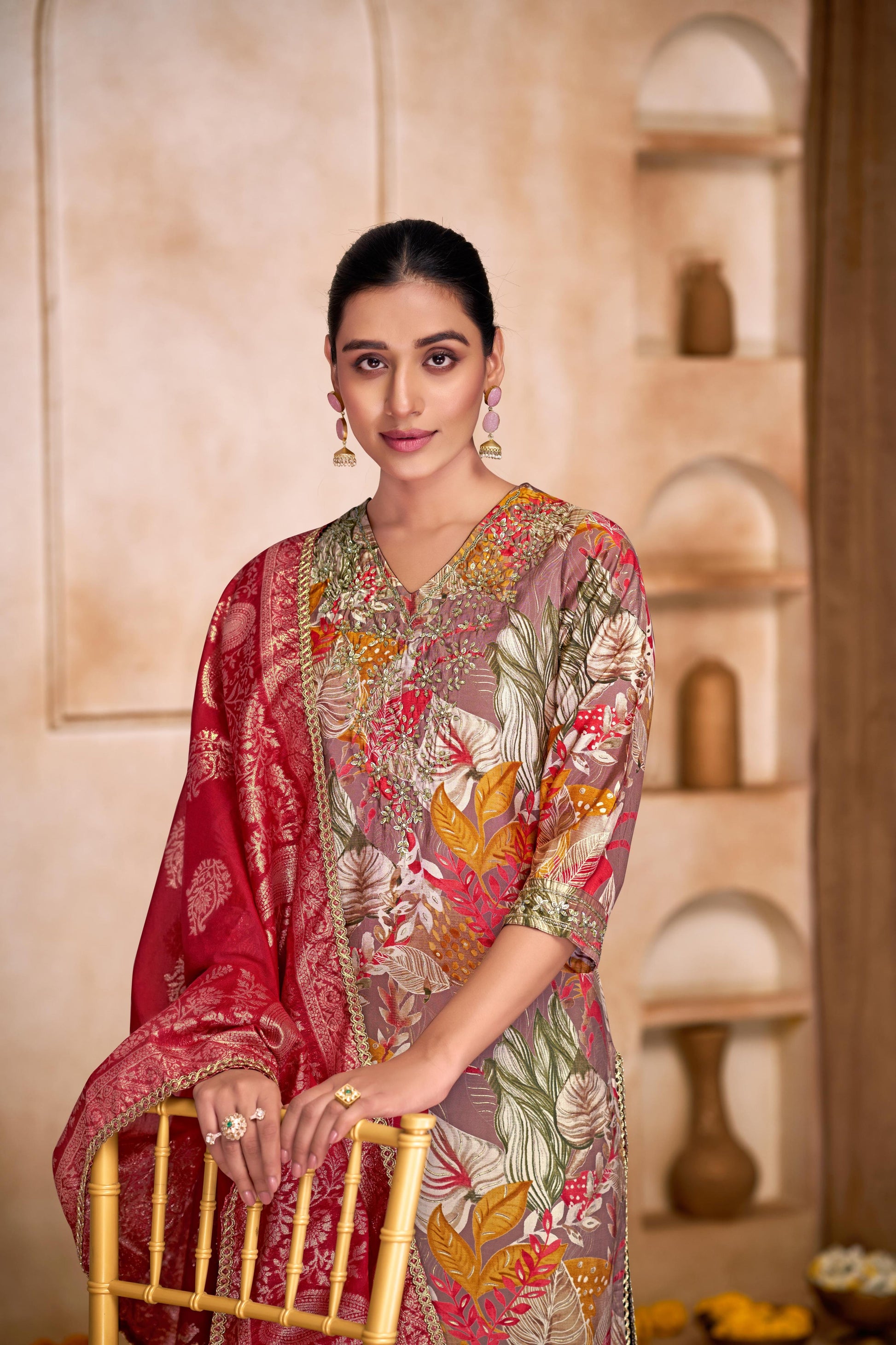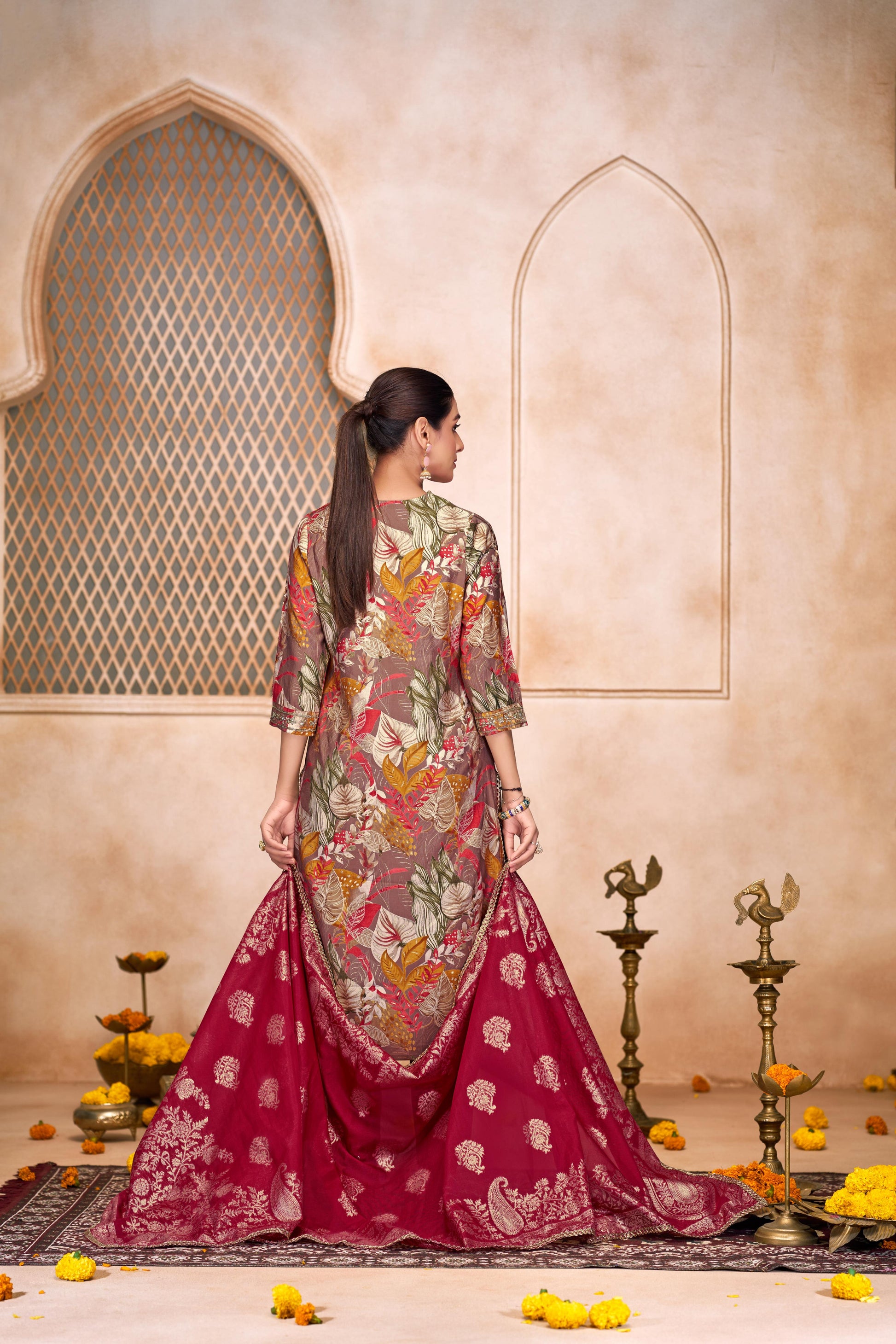 Shehnaaz Brown & Purple Floral Leaf Printed Kurta Set with Dupatta is a refined three-piece ensemble in an elegant brown and purple palette featuring floral-leaf prints, tailored for effortless festive-to-casual dressing with comfort and sophistication. The set pairs a straight-fit kurta with matching trousers and a coordinated dupatta for a complete, polished look.