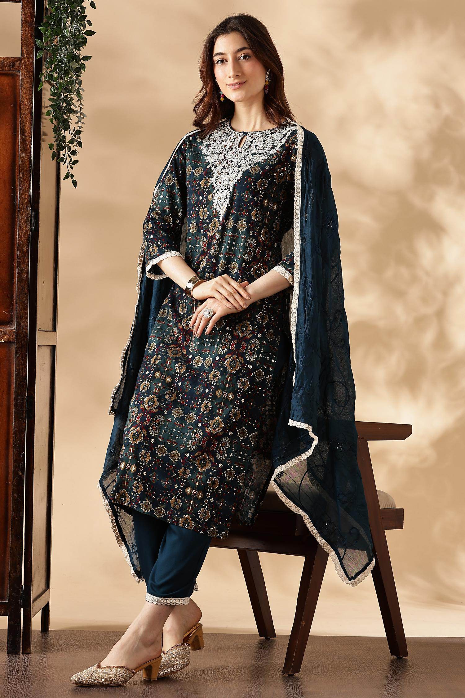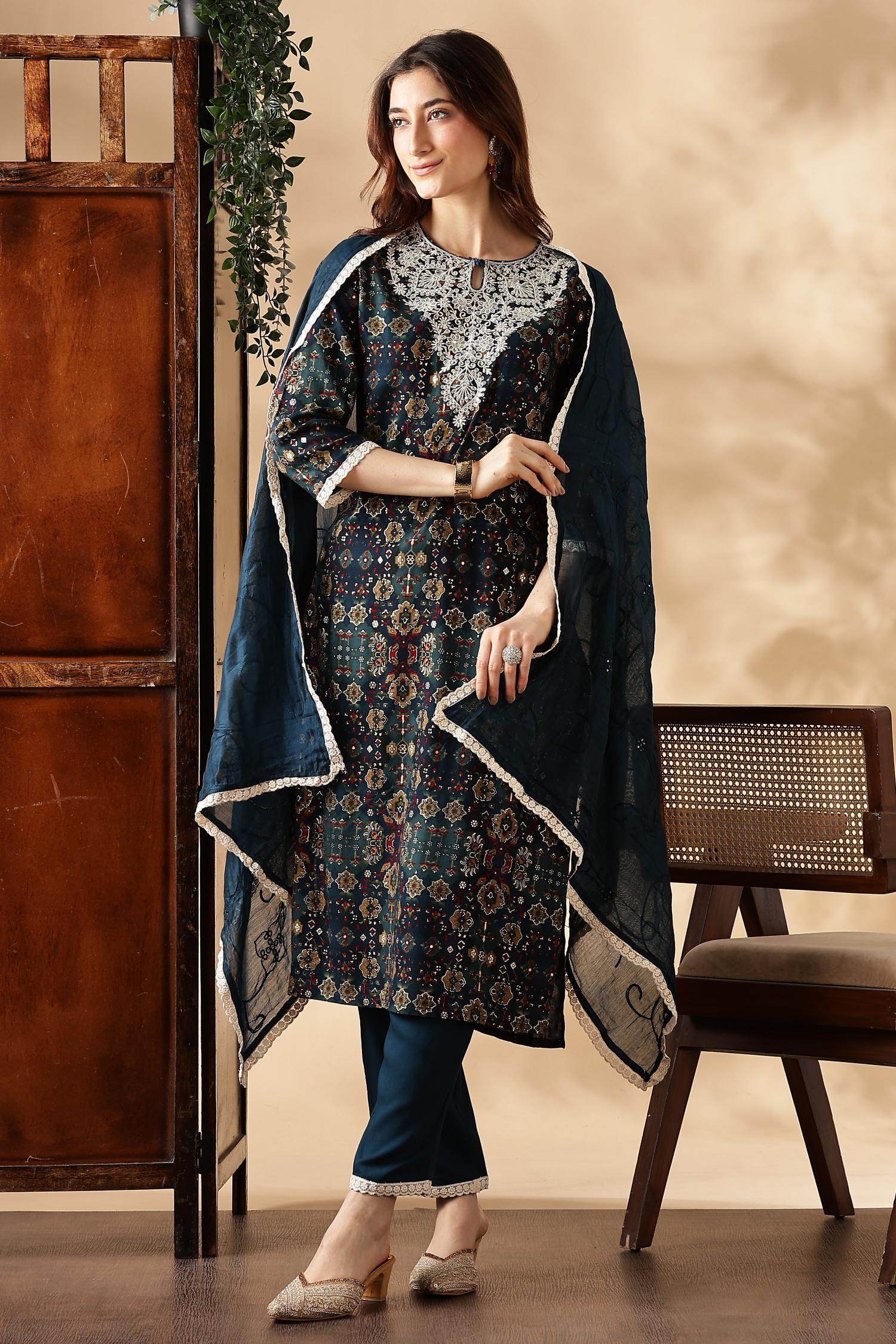 Lightweight chiffon dupatta complements the kurta and adds elegance